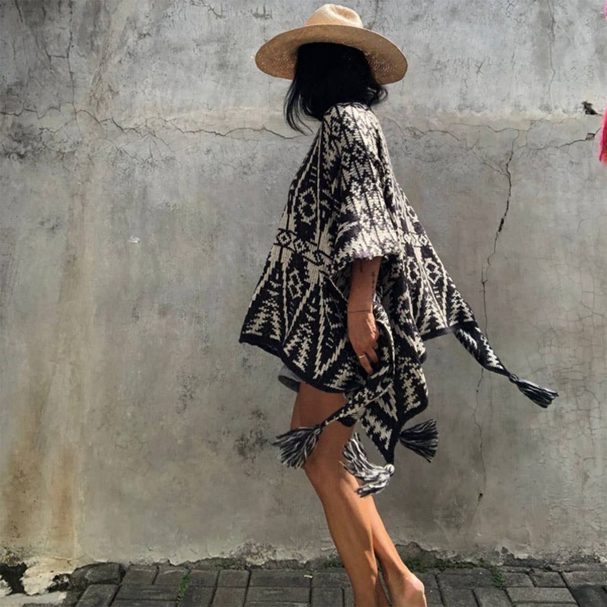 PULLOVER KNITTED CAPE SHAWL BAT PRINT TASSEL SHAWL