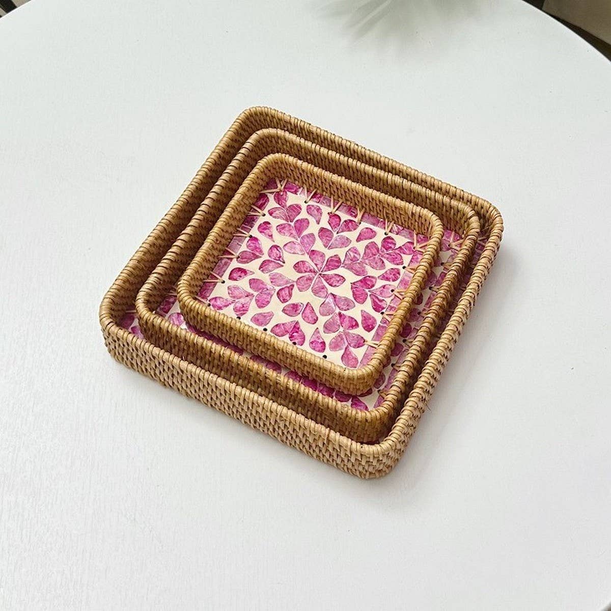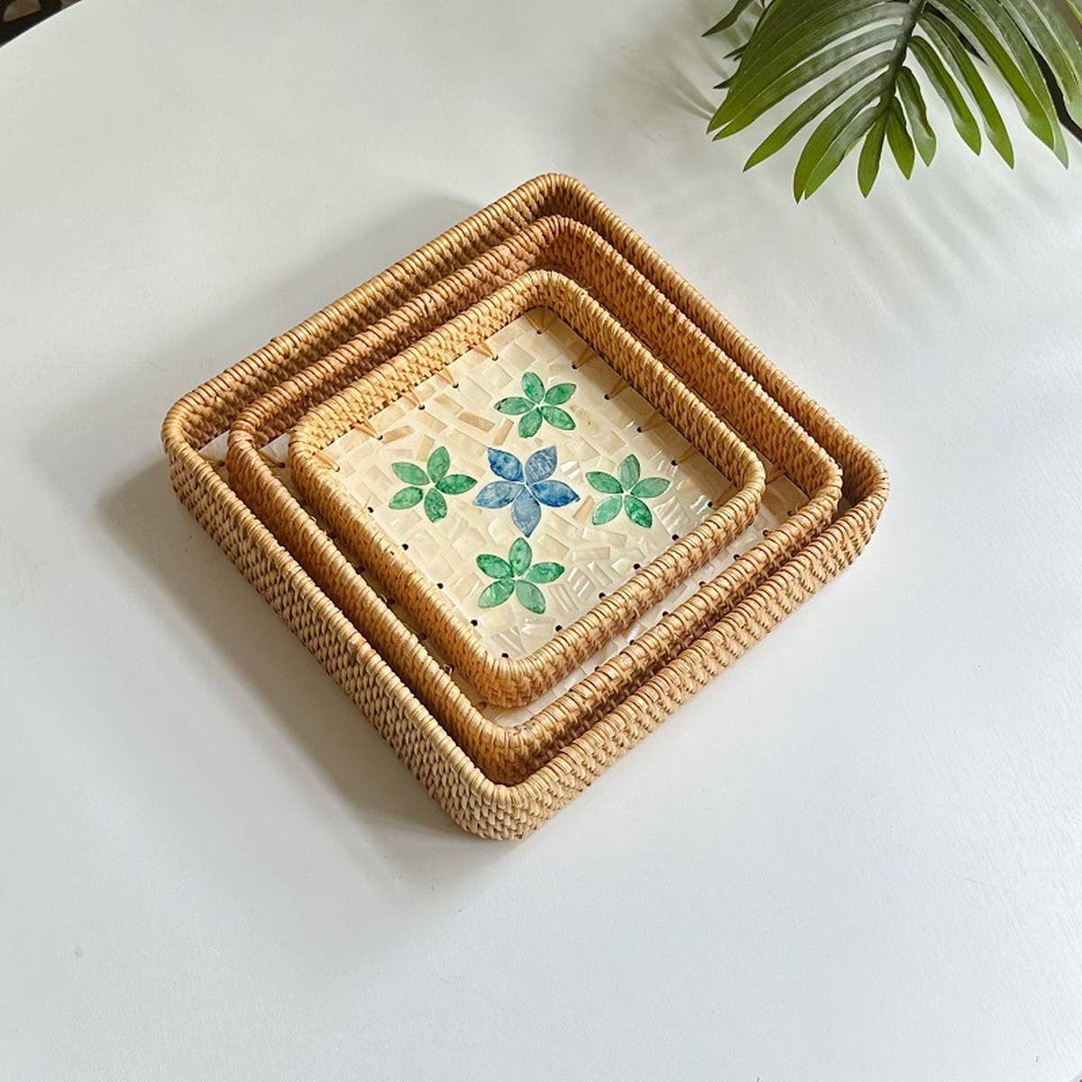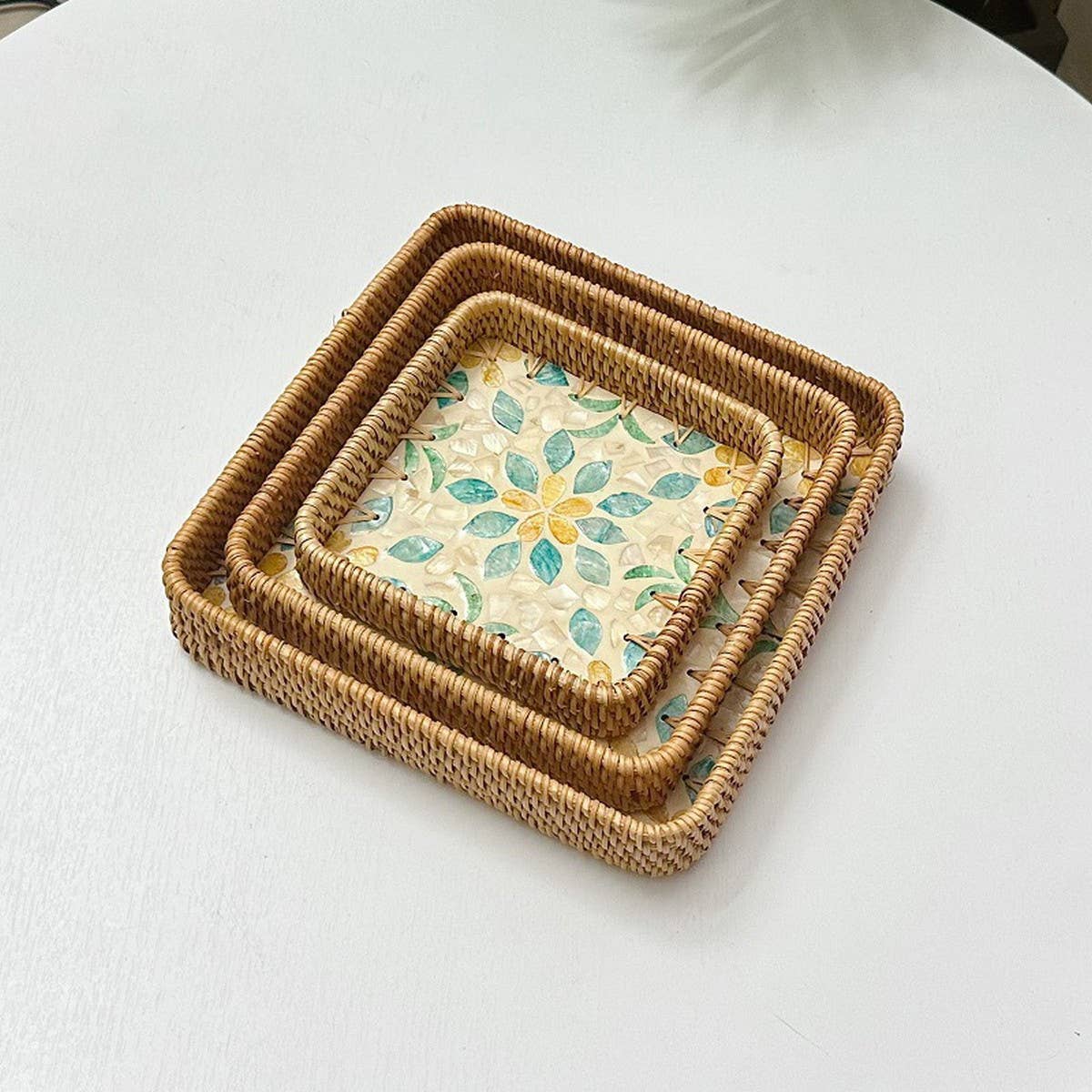 RATTAN COLORFUL SHELL FRUIT TRAY THREE-PIECE SET SIZE:S:Length 17.5cm (6.89 inches) Width 17.5cm (6.89 inches) Height 3.5cm (1.38 inches) M:Length 22.5cm (8.86 inches) Width 22.5cm (8.86 inches) Height 4cm (1.57 inches) L:Length 26.5cm (10.43 inches) Width 26.5cm (10.43 inches) Height 5cm (1.97 inches) 100% WOOD MADE IN CHINA