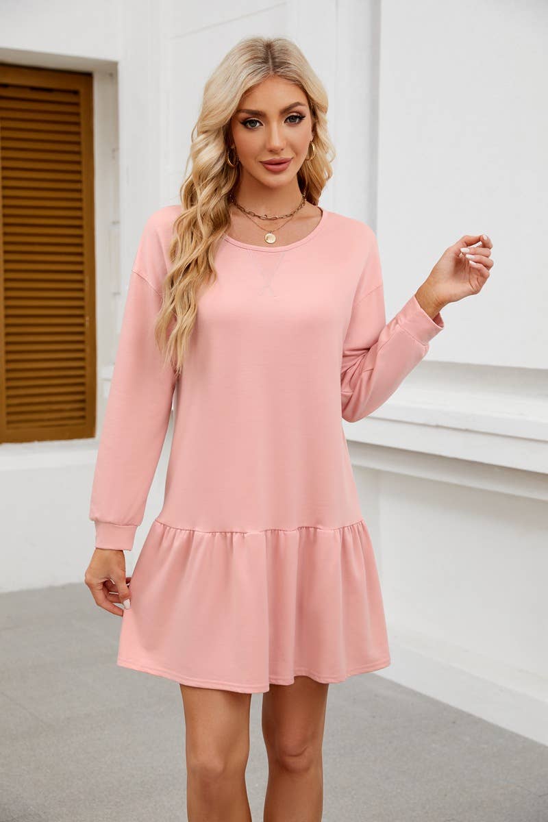 ROUND NECK LONG SLEEVE SOLID COLOR SHORT DRESS