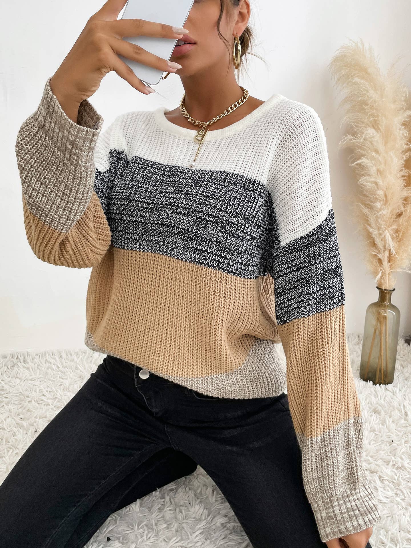 Round-neck long-sleeved color-blocking sweater