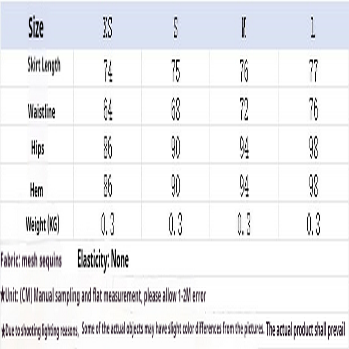 '- Material: Polyester (polyester fiber)\n- Size: XS, S, M, L\n- Weight: 300g\n? This size is Asian size, 1-2 sizes smaller than US size. Please check the size chart carefully.