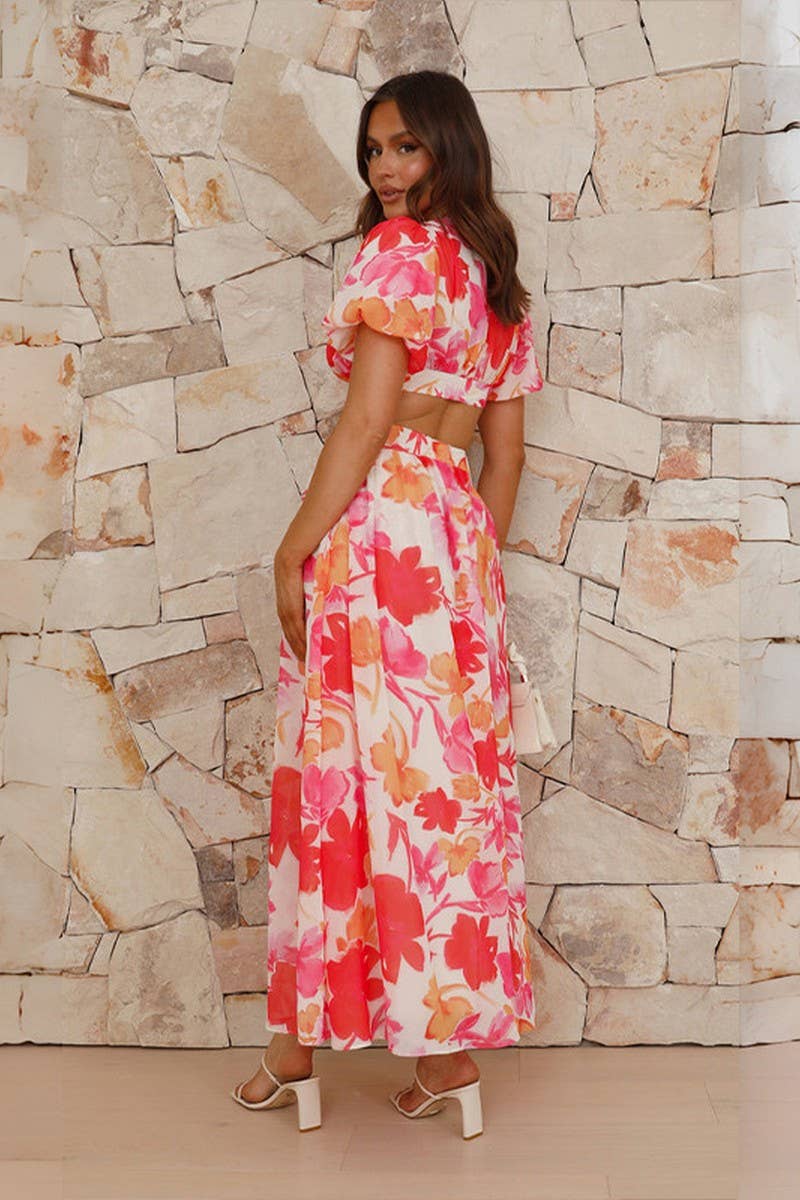 SEXY SLIM V NECK PUFF SLEEVE PRINT SWING DRESS