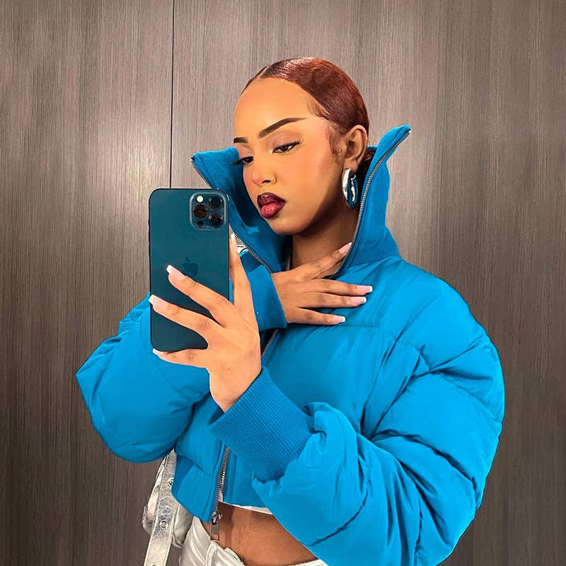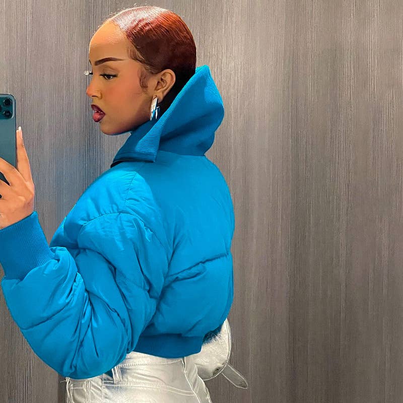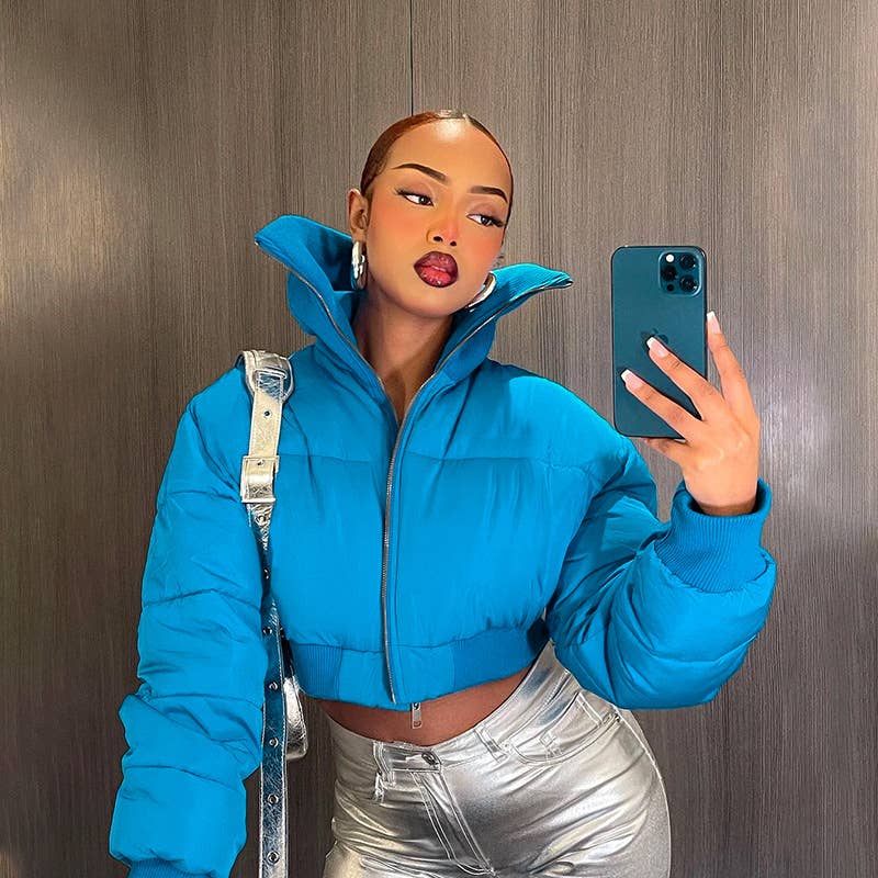 Simple casual high neck zipper cropped quilted jacket