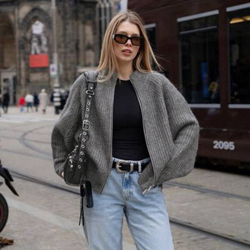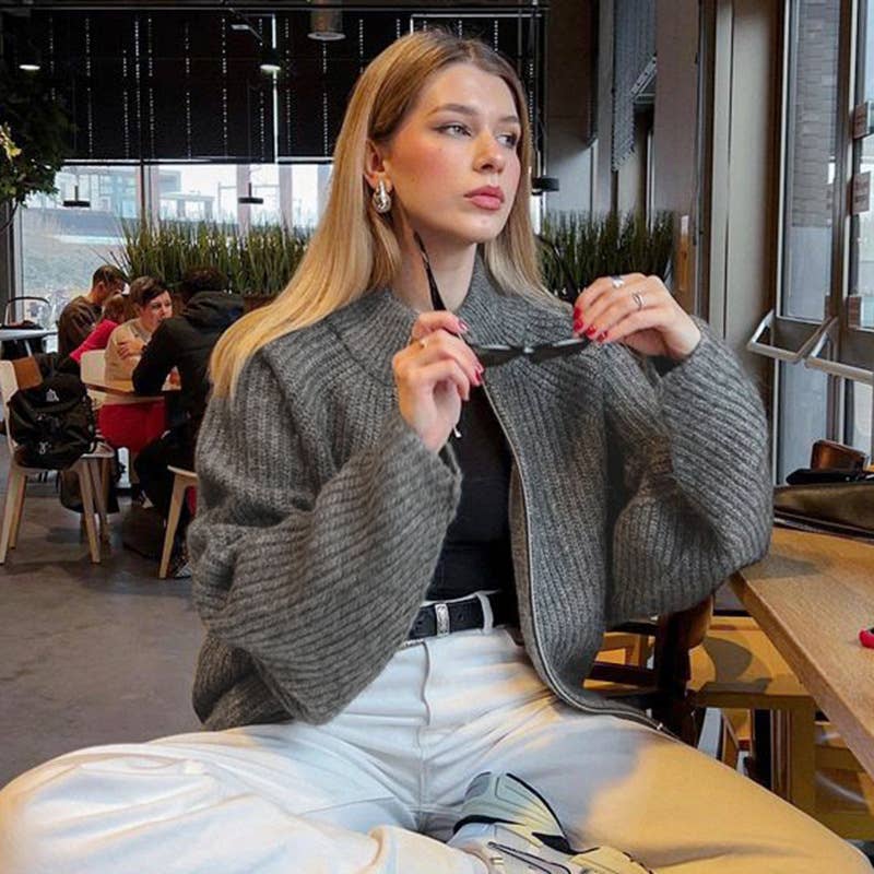 SOLID COLOR CARDIGAN WITH DOUBLE ZIP HEAD LAPEL
