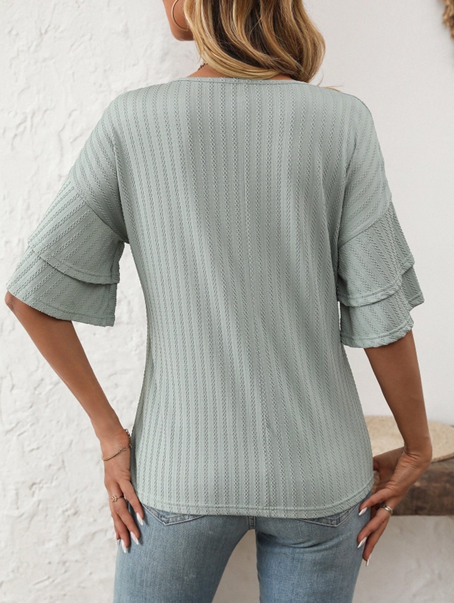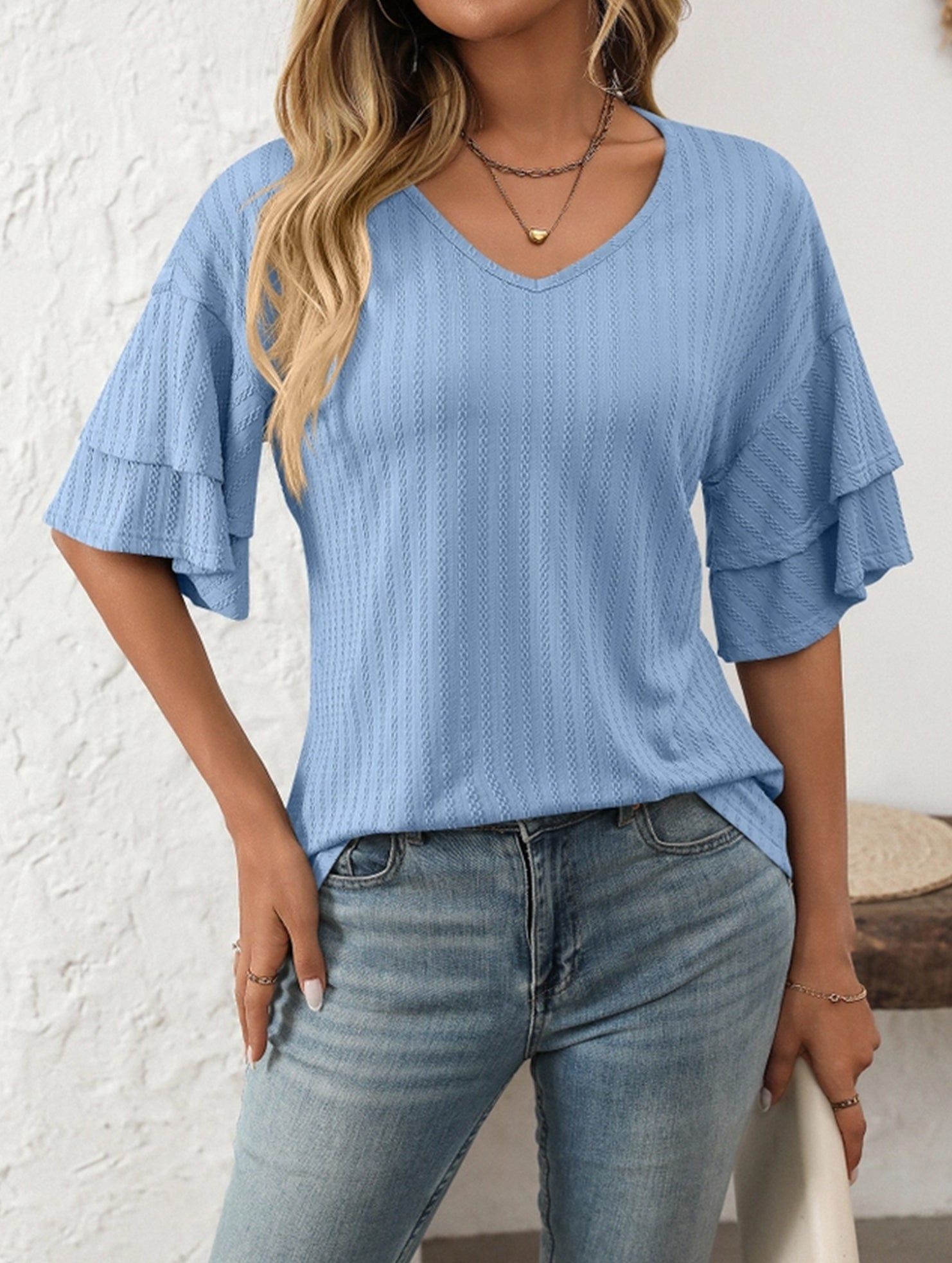 Solid Color V-Neck T-Shirt with Lotus Sleeves ??Feminine, Soft & Breathable