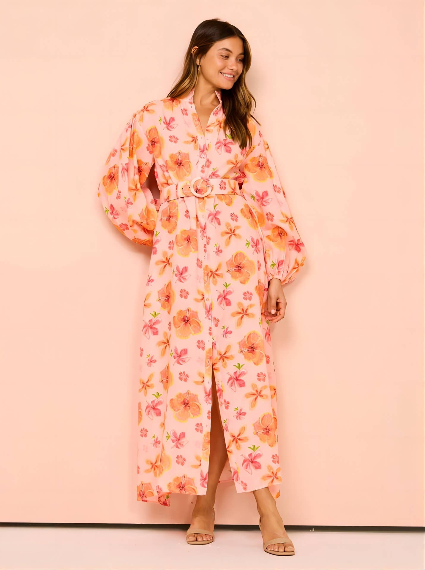STAND COLLAR LANTERN SLEEVE SLIT LONG DRESS