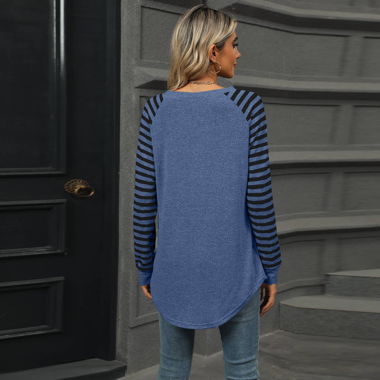 STRIPED PATCHWORK CREW NECK LONG SLEEVE T-SHIRT