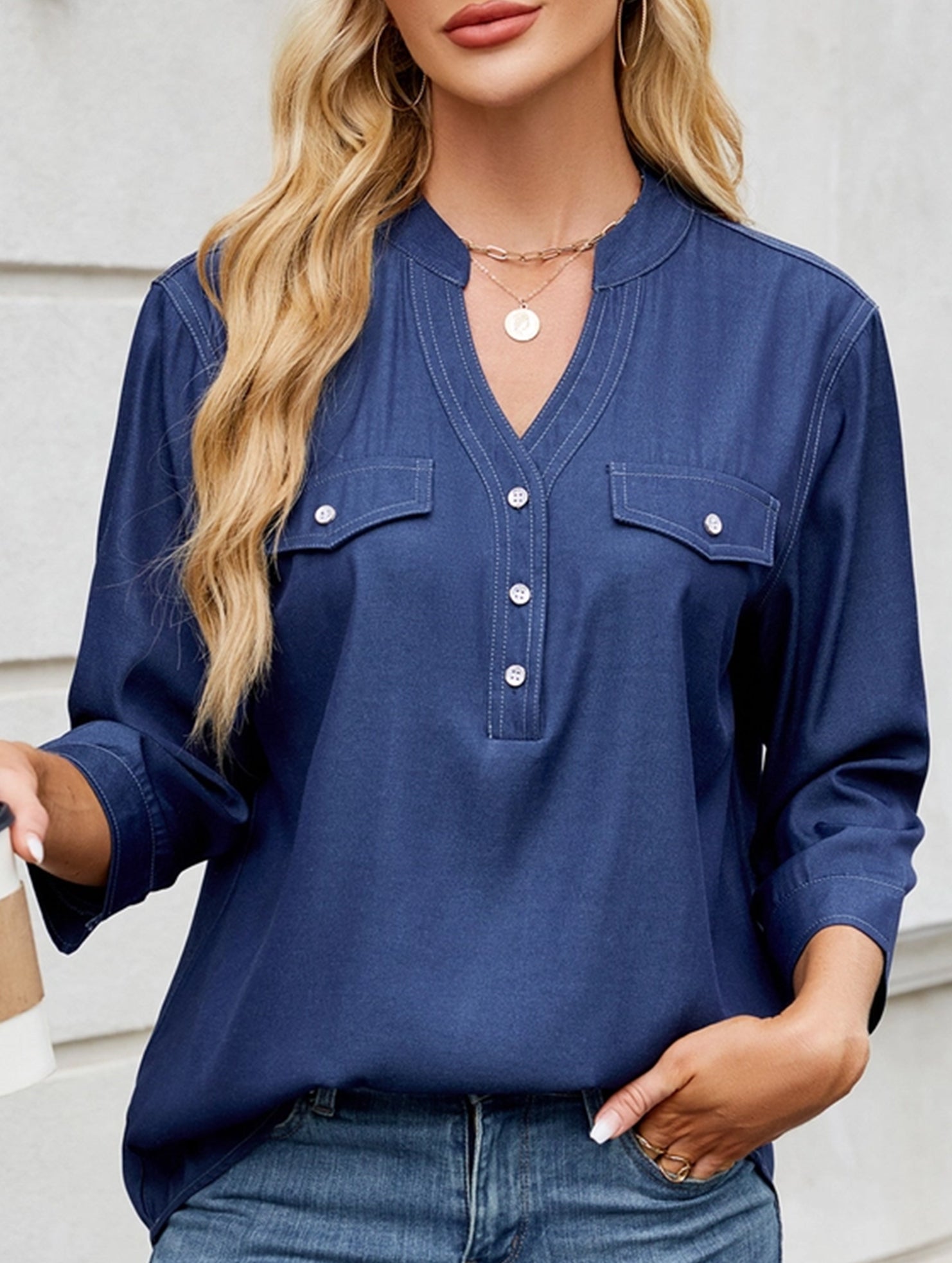 V-neck half-breasted casual imitation denim shirt