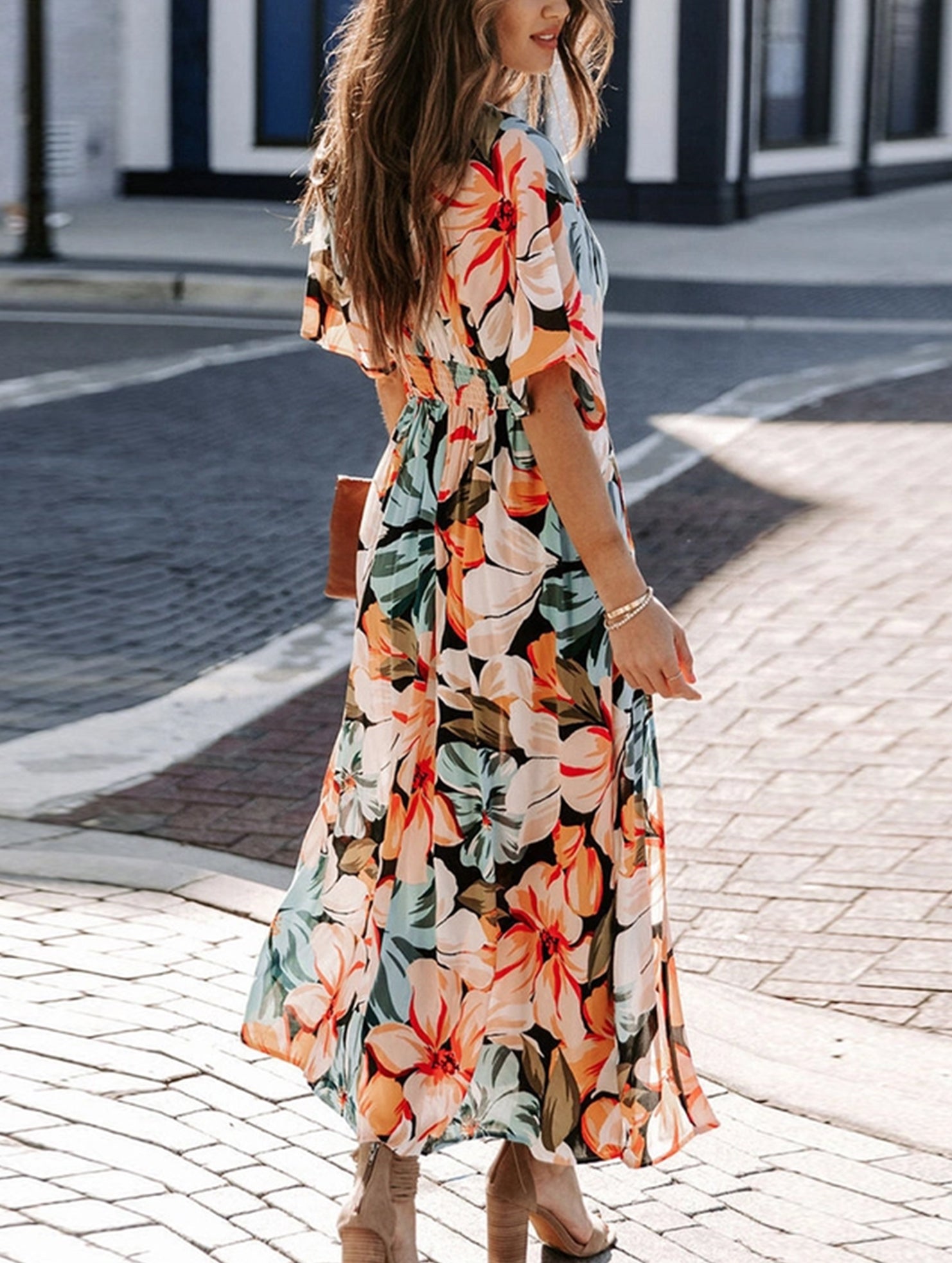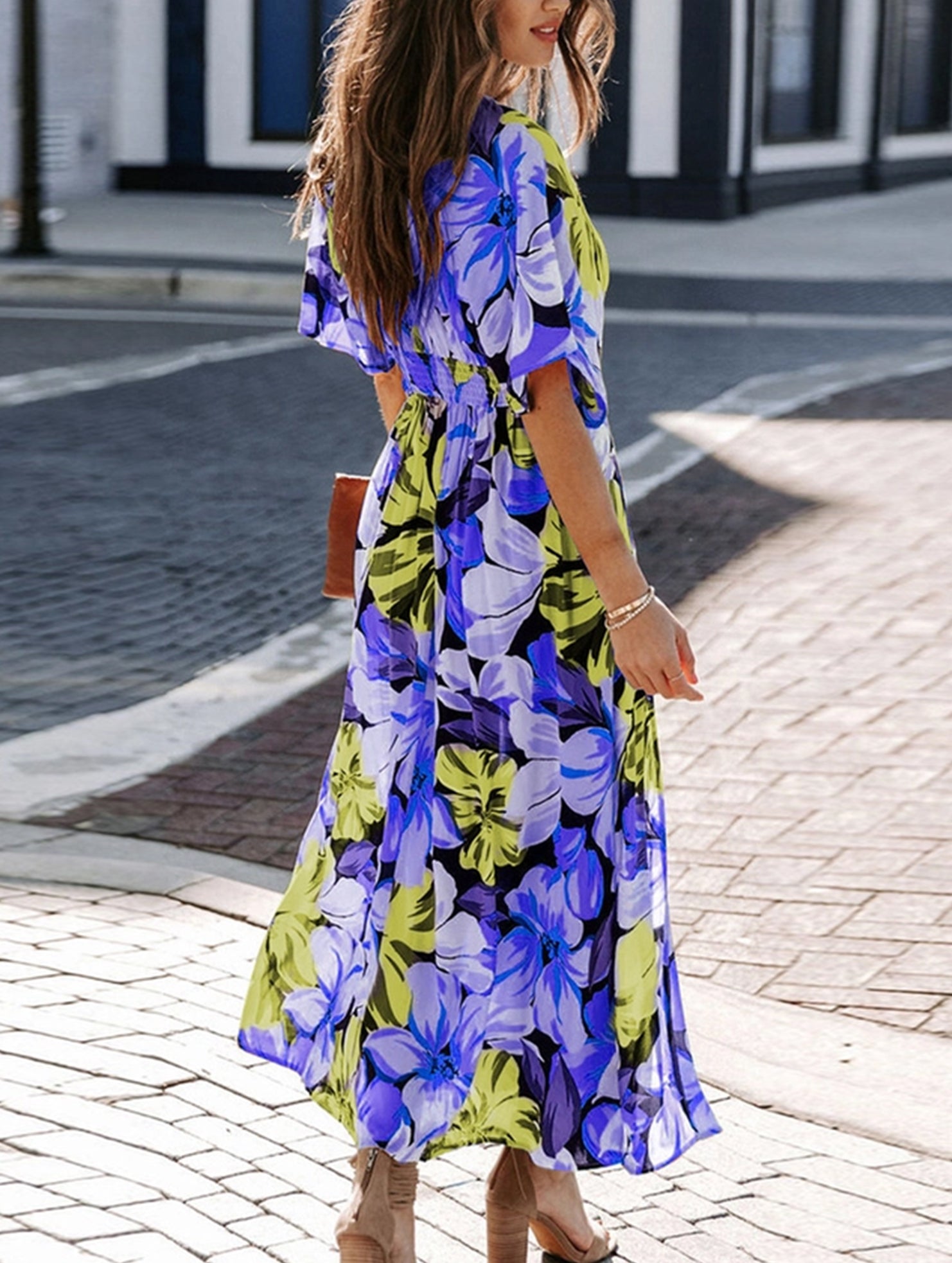 This V-neck high Slit Dress is light, soft, and easy to wear. It has a high waist, a pretty print, and a stylish slit that lets you move freely. The A-line shape gives a nice fit and flowy feel.
