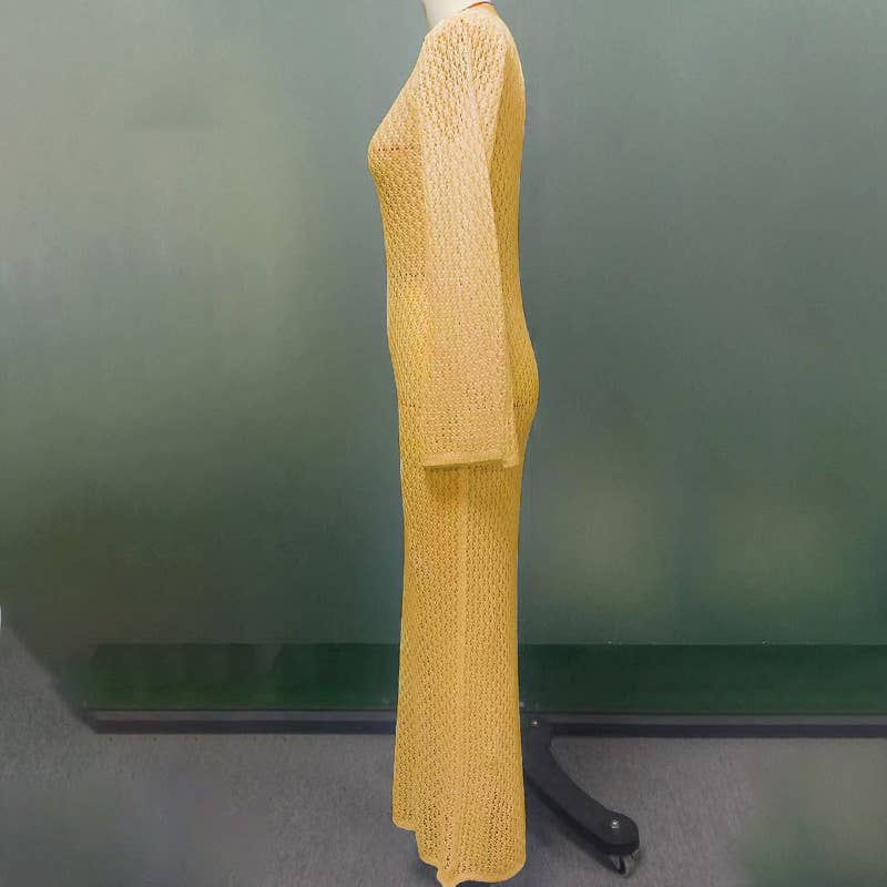 V-Neck Long Sleeve Fit Solid Hollow-Out Dress
