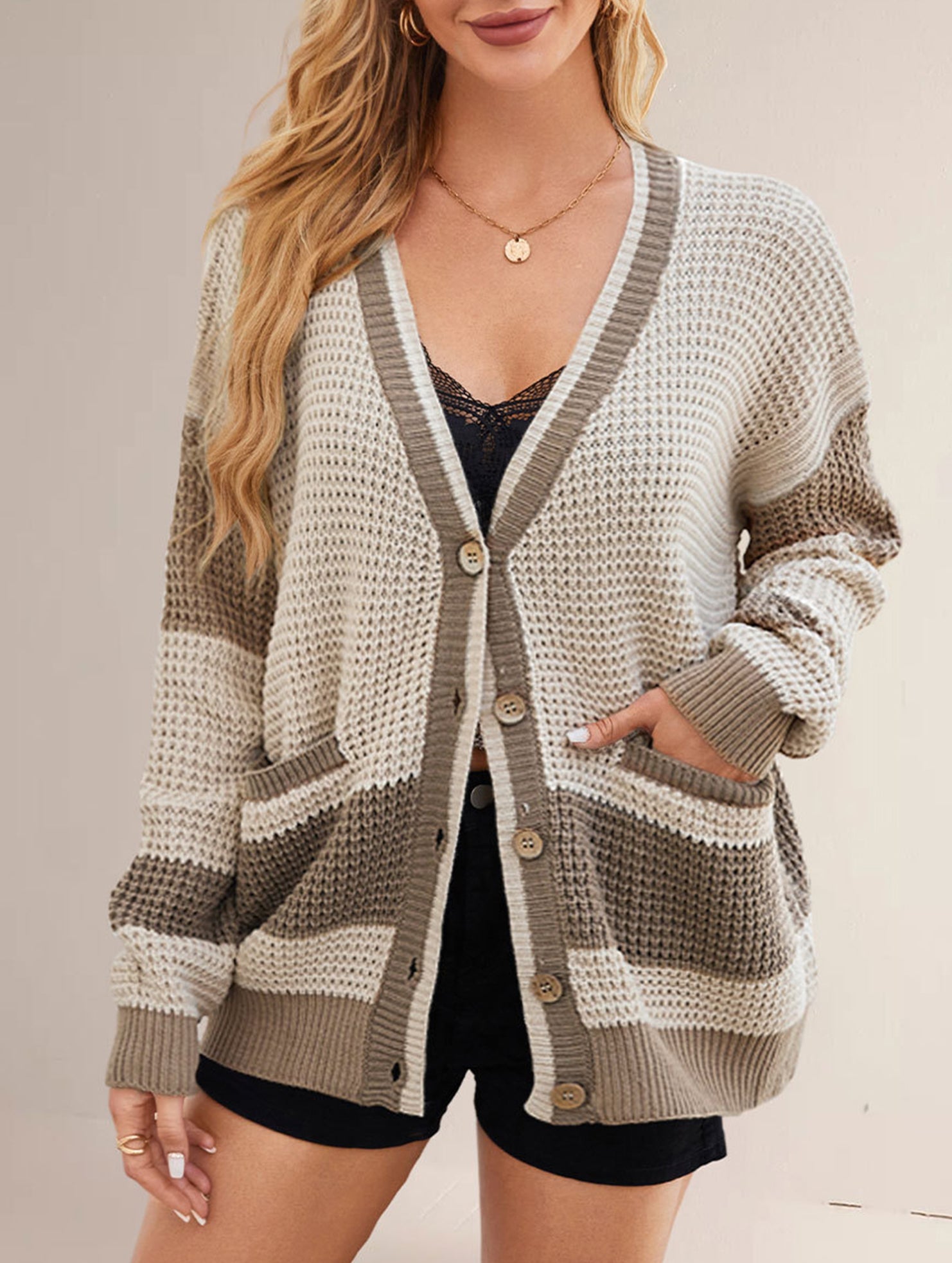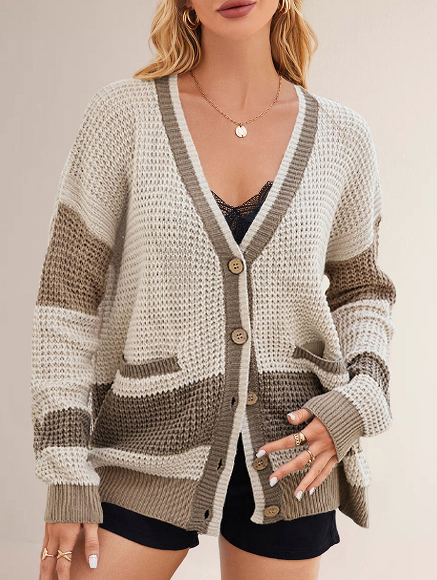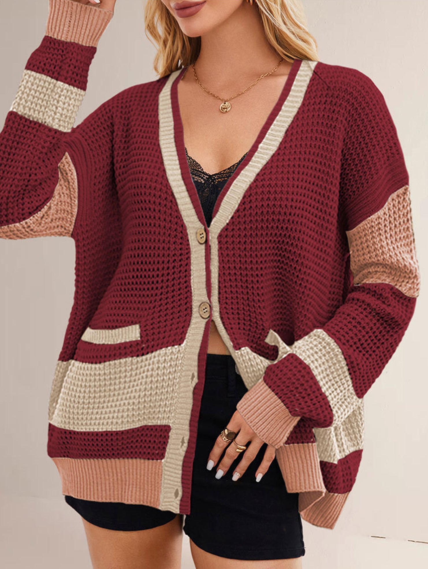 V-neck oversized colorblock cardigan sweater