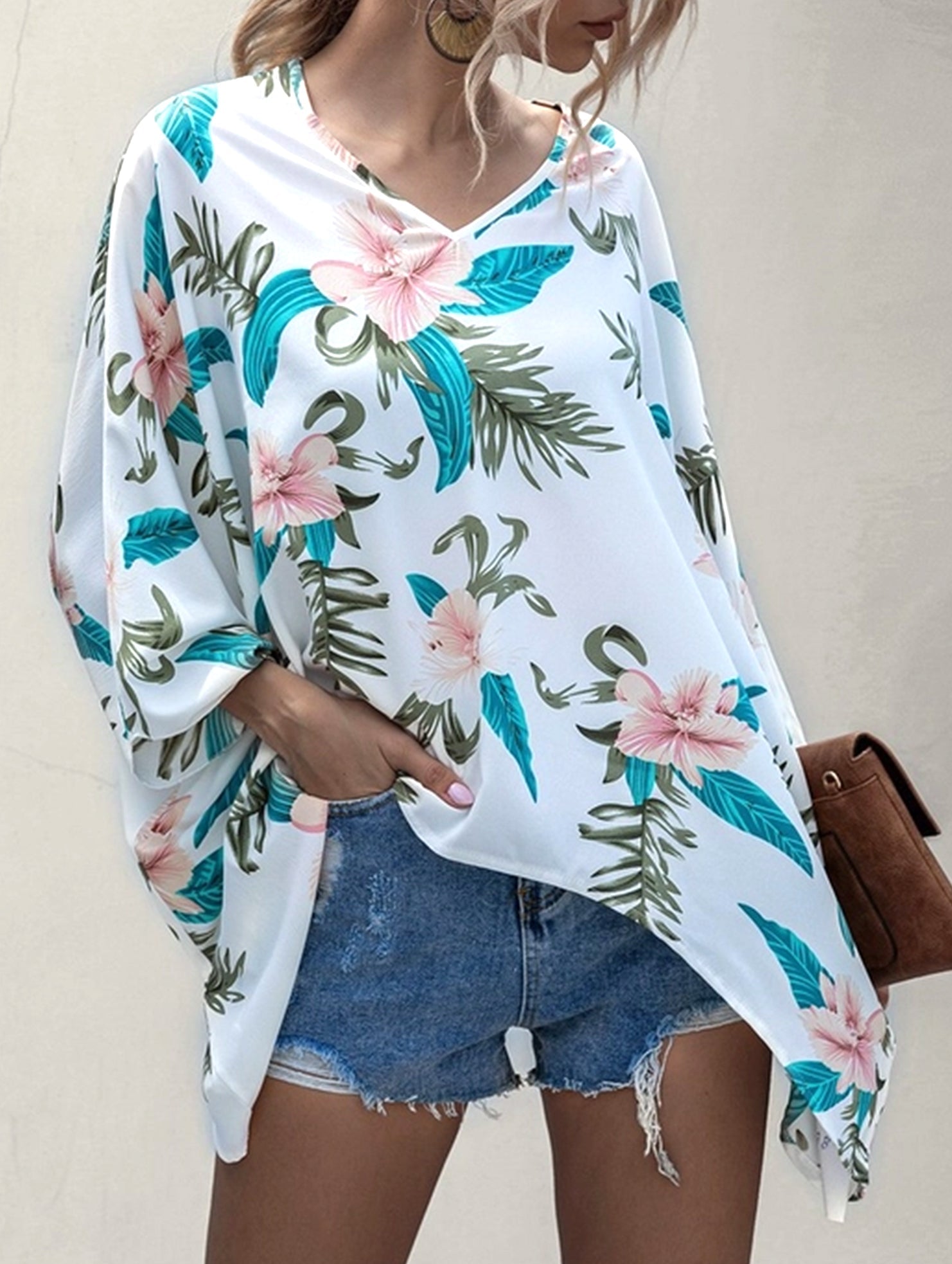 This bat-sleeve top is super soft and comfy. It has a fun print, a V-shaped neck, and wide sleeves that feel loose and cool. The baggy fit lets you move easily and stay relaxed all day.