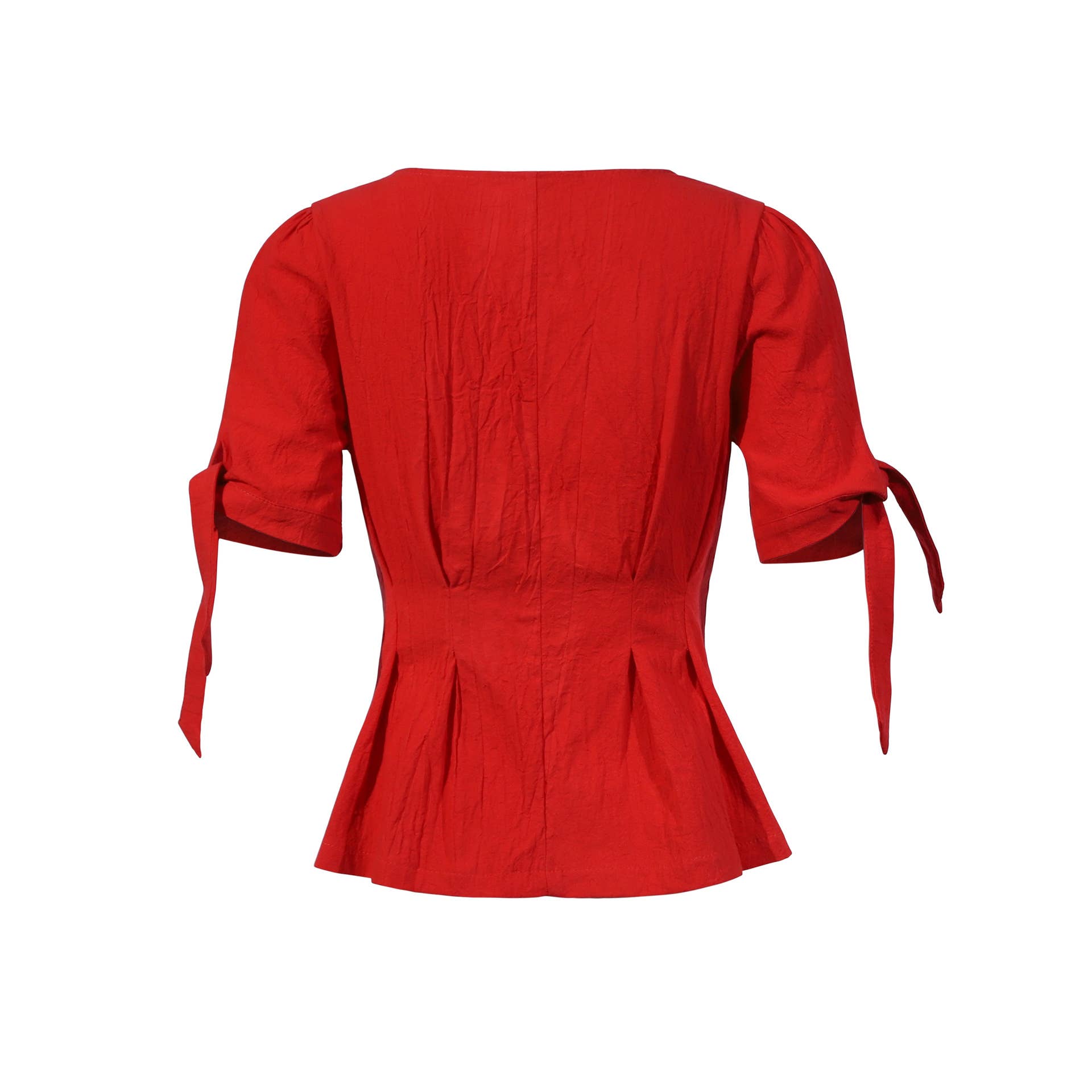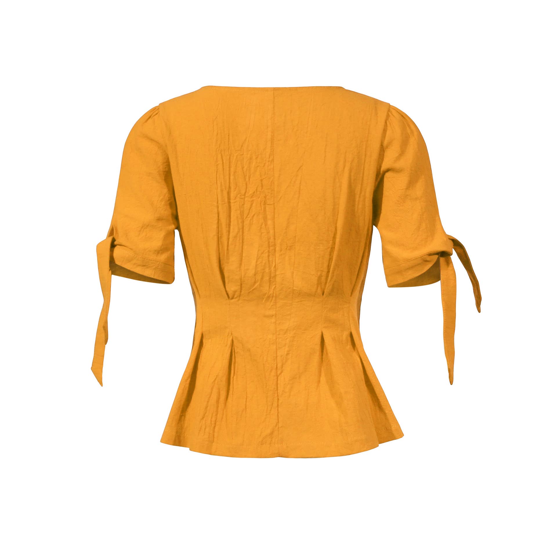 V-NECK STRAP WAIST BUTTON COTTON LINEN BLOUSE