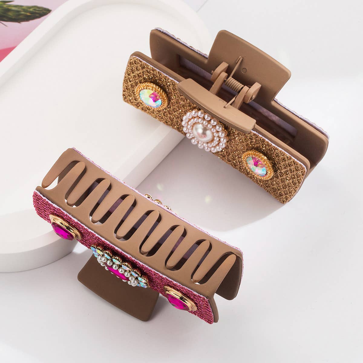 ? Size: 10.5 cm x 3.5 cm / 4.13 in x 1.38 in\n? Material: Glass, Pearl, Turquoise\n? Design Elements: Elegant quadrilateral shape featuring a mix of pearl, turquoise, and glass textures ?????\n? Style: Chic and artistic, perfect for adding a refined and natural touch to everyday or occasion hairstyles\n\n#glasshairclip #pearlclip #turquoisestyle #geometricaccessory #eleganthairclip #10_5cmclip\nTypes of products that will be on the shelves during this period:\nHair claw clip set, large hair claw clip, flower hair claw, boho claw clip, pearl hair claw, modern hair claw, rhinestone claw clip, colorful hair claw, hair clips claw, hair clips for women, wholesale hair clips, bulk hair clips, hair clip display, clips for hats, clips for kids, mini hair clips, trendy hair clips, fashion hair claws, strong hold hair clip, acrylic claw clip.