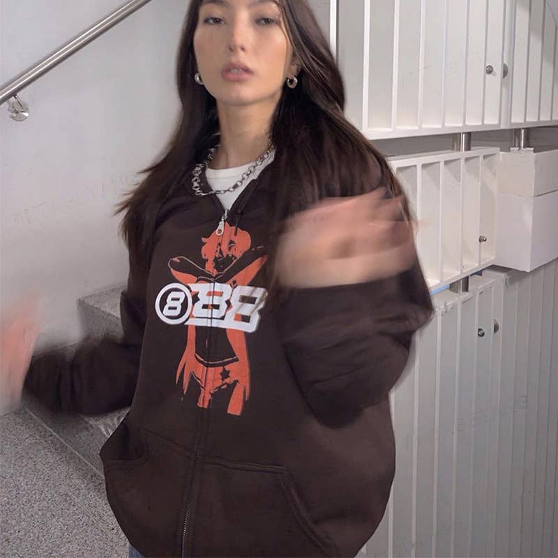 Vintage solid brown long-sleeved zipper hoodie