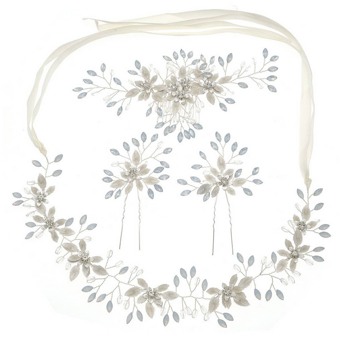 WEDDING DRESS BRIDAL HEADDRESS THREE PIECE SET\nSIZE:OS(1)\n100% CRYSTAL\nMADE IN CHINA \nBRIDAL HAIR ACCESSORIES FOR UPDOS,BRIDAL HAIR ACCESSORIES WITH COMBS,BRIDAL HAIR ACCESSORIES WITH VEILS,BRIDAL HAIR ACCESSORIES WITH CRYSTALS,BRIDAL HAIR ACCESSORIES WITH HEADBANDS,GEMSTONE BRIDAL HAIR ACCESSORIES,BRIDAL HAIR ACCESSORIES WITH TIARAS,BRIDAL HAIR ACCESSORIES WITH FEATHERS,BRIDAL HAIR ACCESSORIES WITH CLIPS