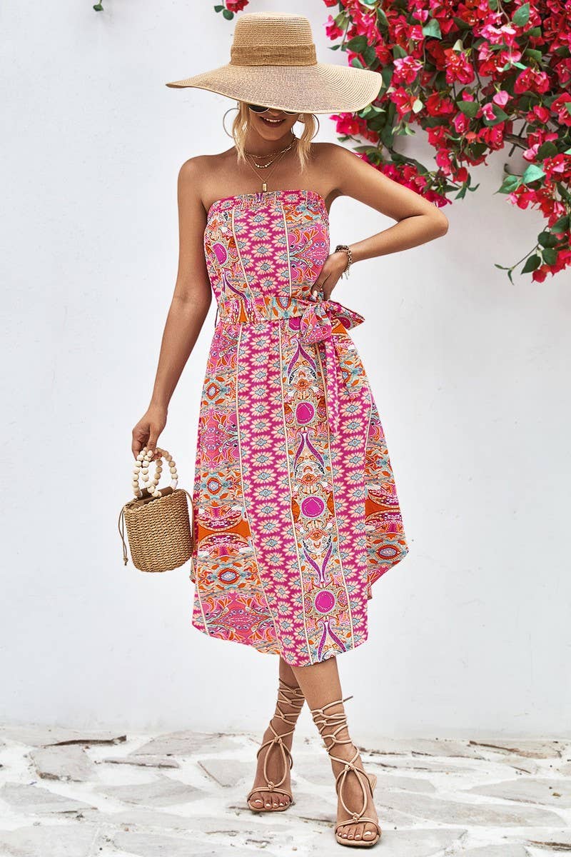 A stylish strapless dress with a fitted silhouette and eye-catching print, perfect for parties, dates, or casual summer outings. Stretchable fabric ensures comfort while flattering your figure.