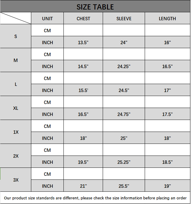 Sizes: S, M, L, XL, 1X, 2X, 3X
