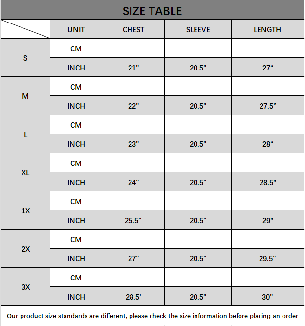Sizes: S, M, L, XL, 1X, 2X, 3X