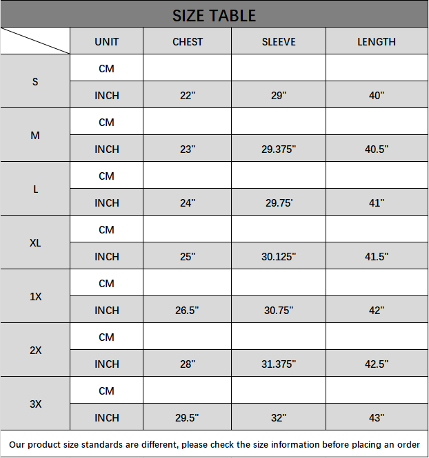 Sizes: S, M, L, XL, 1X, 2X, 3X