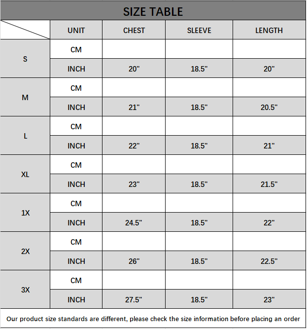 Sizes: S, M, L, XL, 1X, 2X, 3X