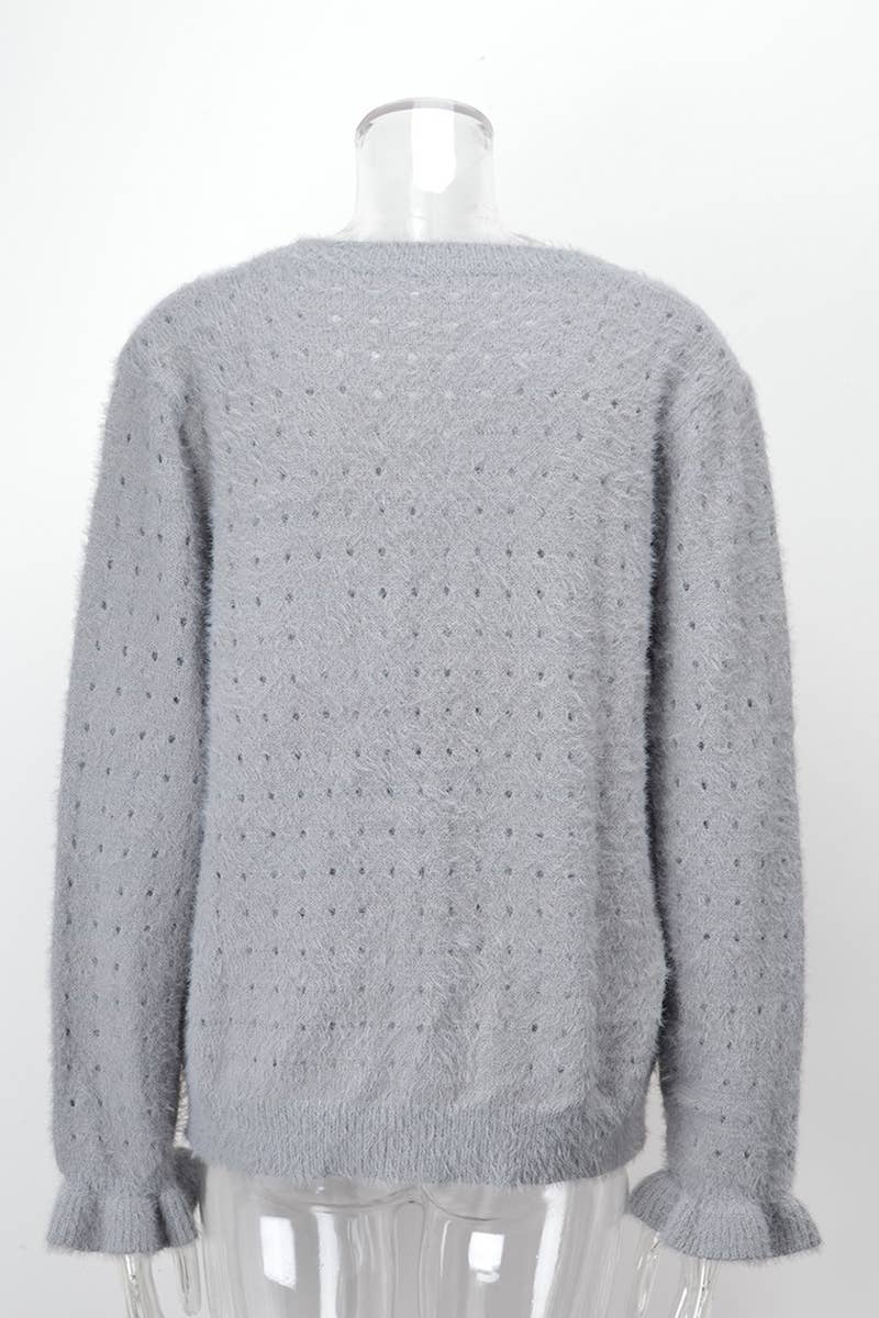 Features: Cut-out design, single-breasted closure, long sleeves, lightweight knit, versatile layering piece