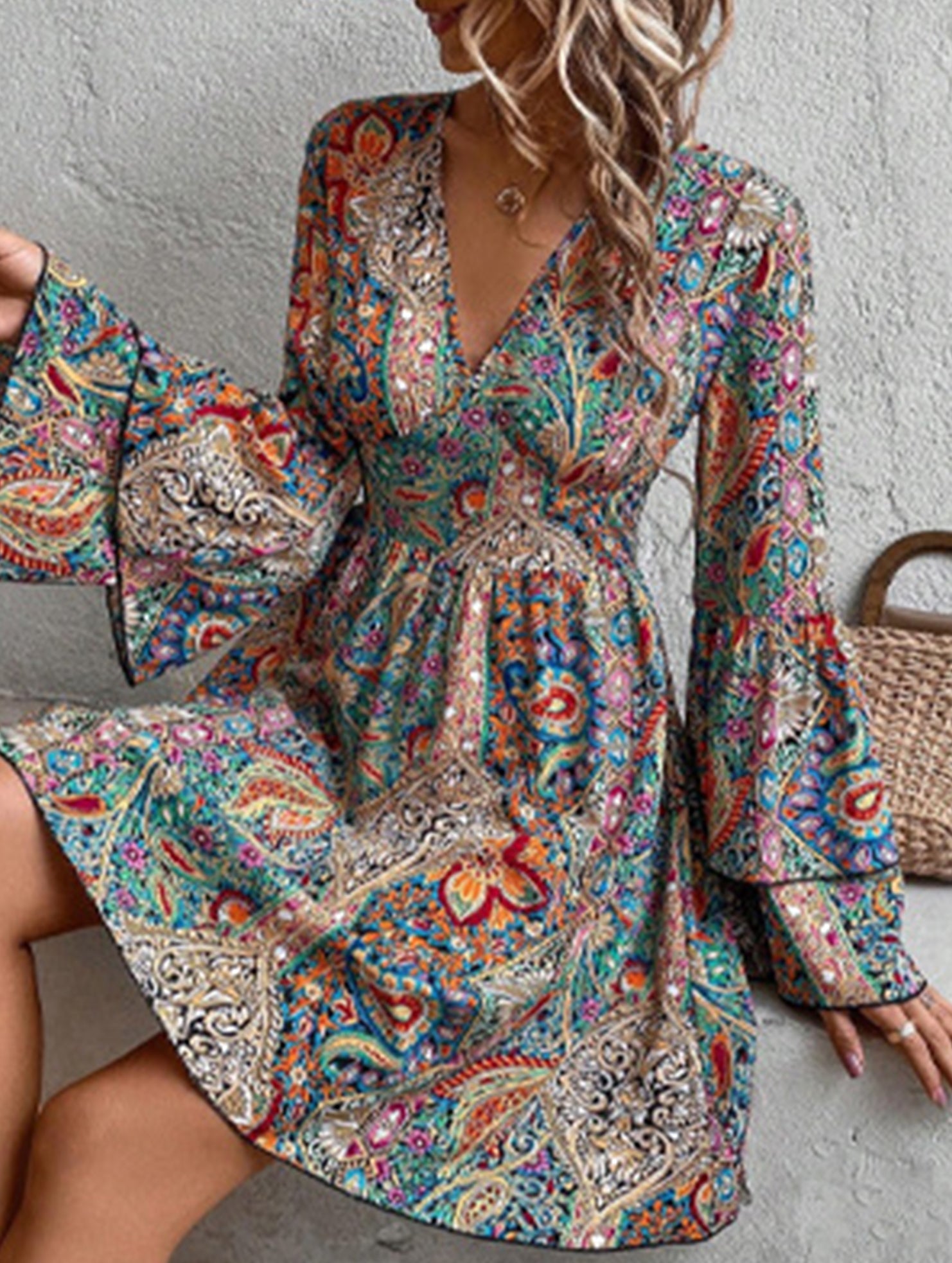Women's Floral Print V-Neck Bell Sleeve Dress