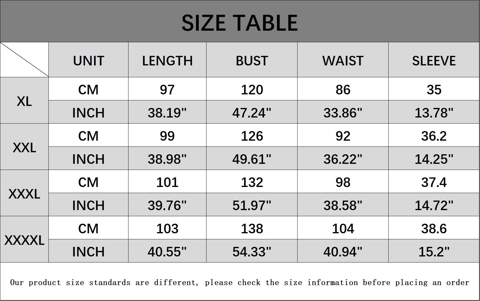 Sizes: XL, XXL, XXXL, XXXXL