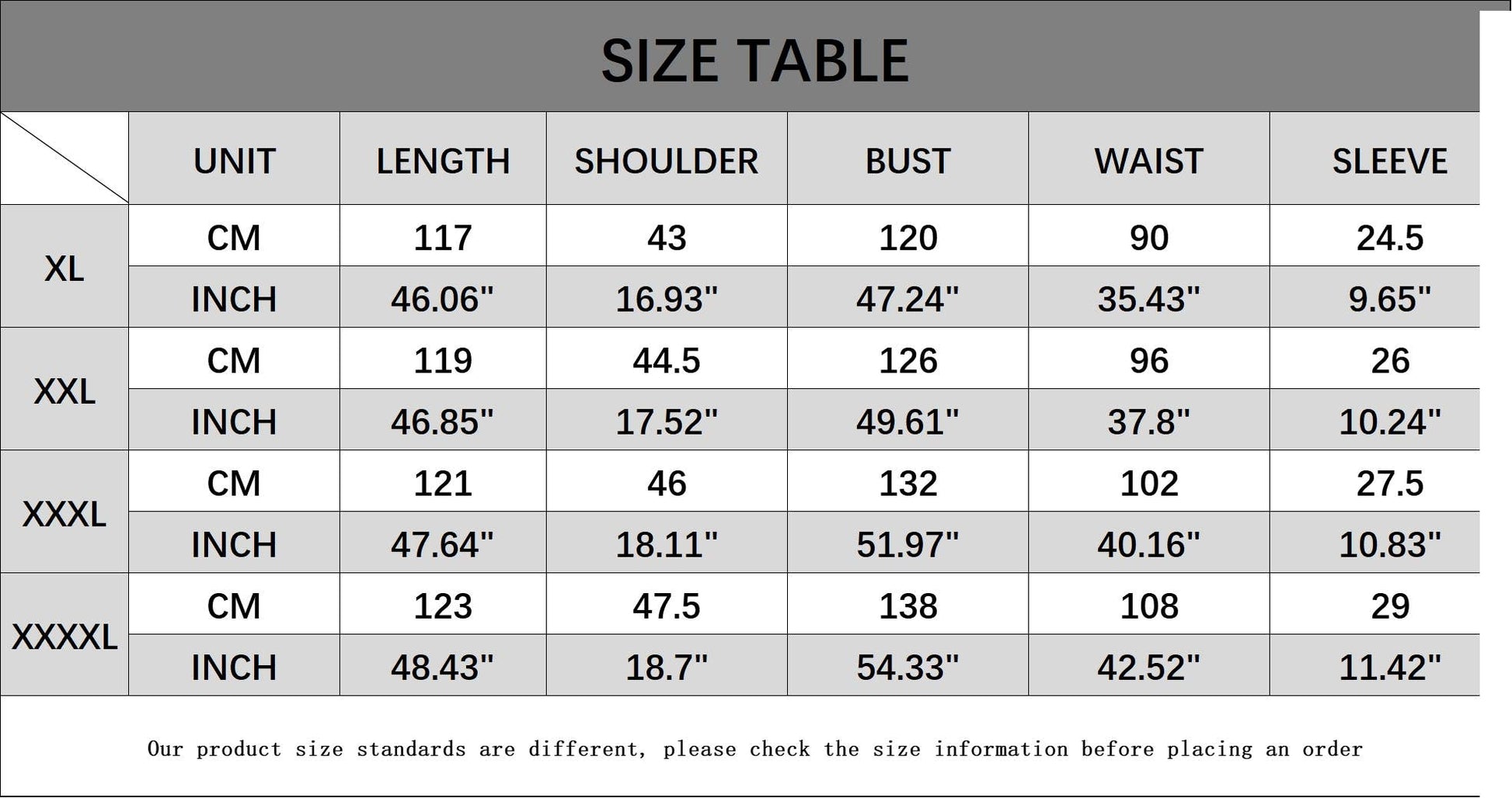 Sizes: XL, XXL, XXXL, 4XL